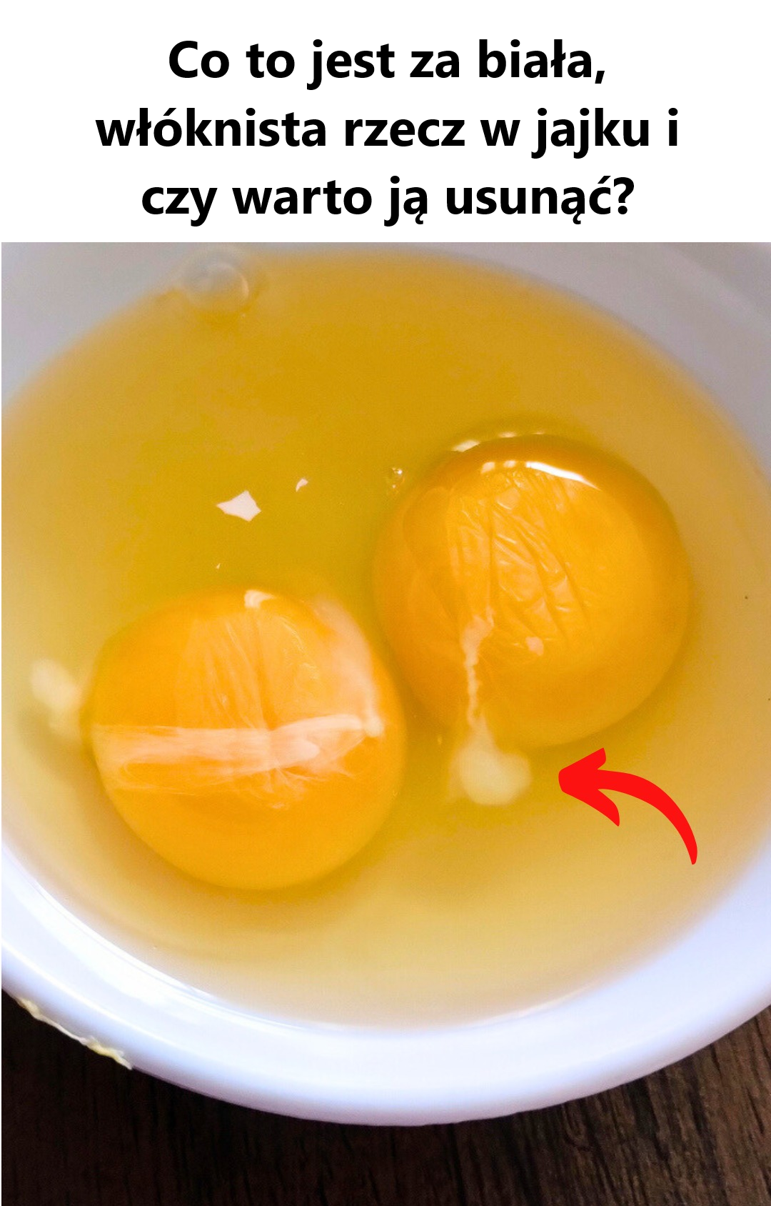 Ta dziwna biała włóknista rzecz nazywa się chalaza. To nie jest zarodek, plemnik ani nic niezwykłego — po prostu część struktury jaja. Rolą chalaza jest działanie jako naturalny stabilizator, utrzymując żółtko w środku białka jajka, podobnie jak pas bezpieczeństwa dla żółtka. Zwykle są dwa chalaza, po jednym z każdej strony żółtka. Obecność chalaza nie oznacza, że jajo jest zapłodnione, więc nie ma potrzeby martwić się o żadne niespodzianki.