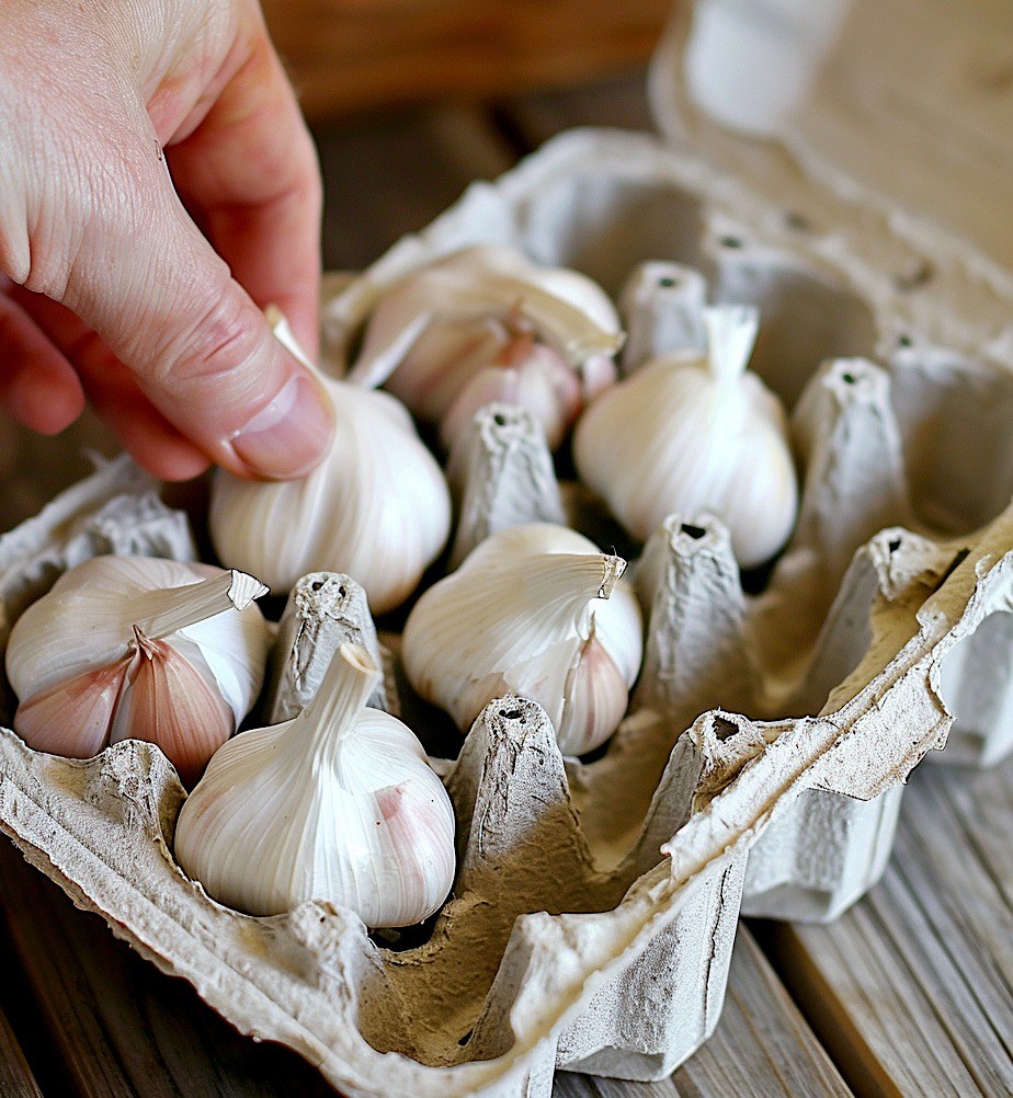 Umieść czosnek w otworach kartonu i przechowuj w chłodnym, suchym i ciemnym miejscu.