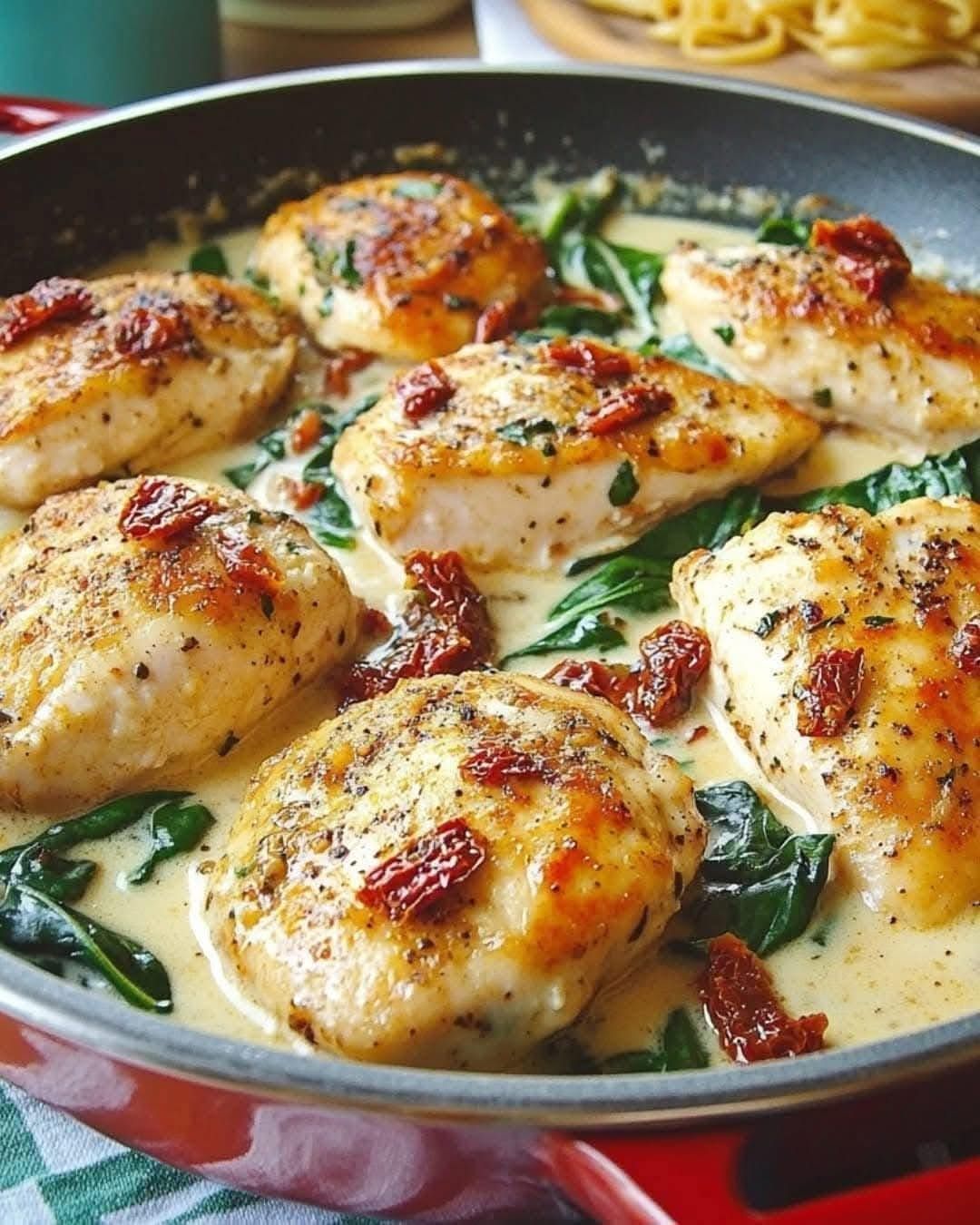 🍴 **Kurczak Florentine** to klasyczne danie kuchni włoskiej, łączące soczystego kurczaka, aksamitny sos śmietanowy, szpinak i aromatyczne suszone pomidory. 🌿✨ Idealne na rodzinny obiad lub elegancką kolację! 🥄
