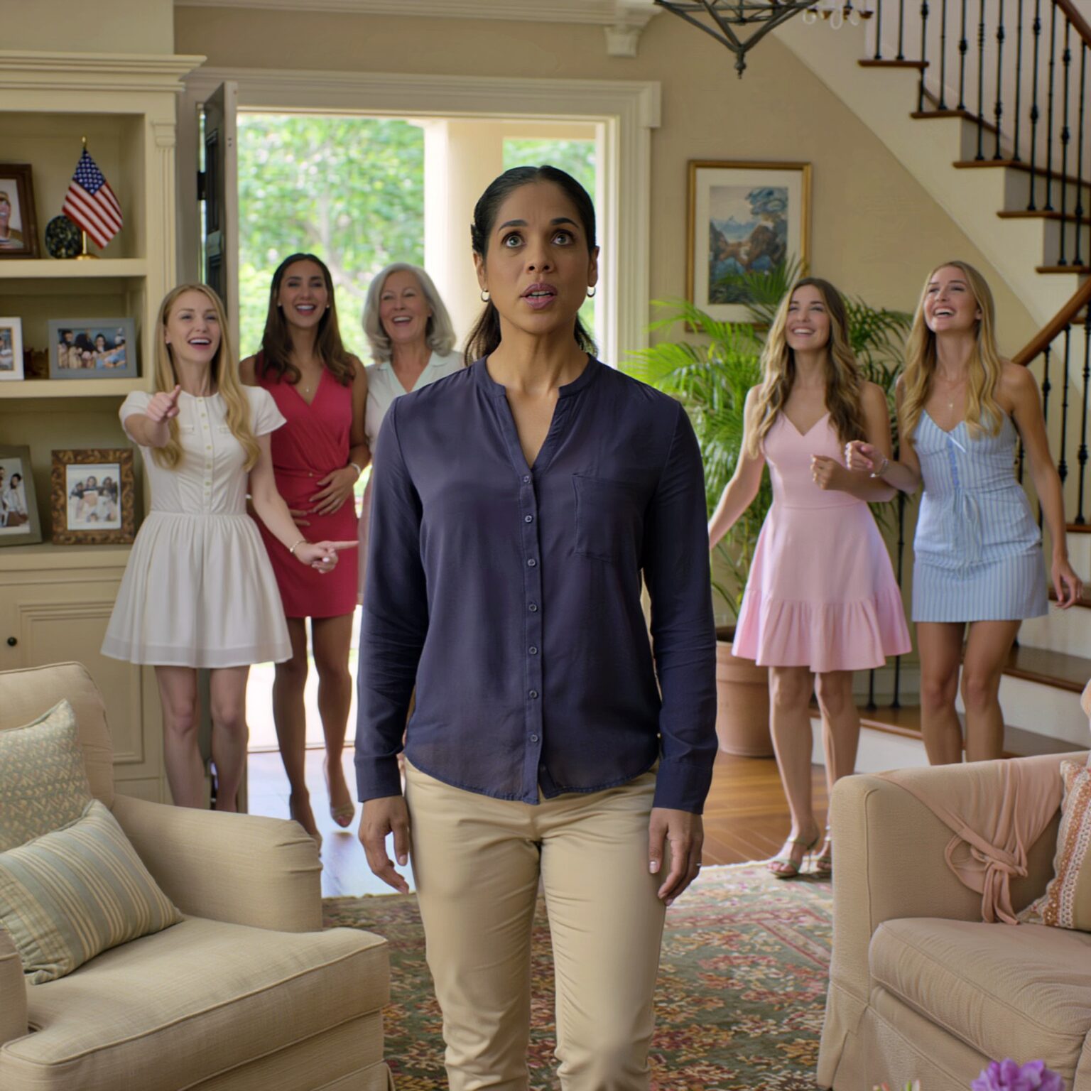 Moje trzy starsze siostry – Briana, Laya i Tessa – stoją po jej bokach, wskazując na nią i rozmawiając z podekscytowaniem. Duża ciężarówka z napędem na cztery koła stoi na krawężniku, a jej ciężka metalowa rampa jest rozłożona na cichej ślepej uliczce. Przy rampie stoją dwaj mężczyźni w niebieskich kombinezonach, trzymając wózek, z wyrazem dezorientacji, ale i rezygnacji.
