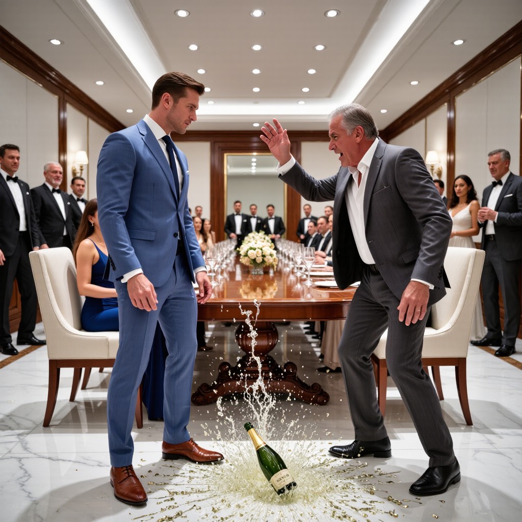Przez ułamek sekundy nikt się nie poruszył. Dźwięk zawisł w powietrzu – eksplodujący kryształ, rozpryskująca się ciecz – a potem rozległ się cichy stukot bąbelków i odłamków osuwających się po wypolerowanym kamieniu. Dom Perignon wczołgał się w stronę włoskich skórzanych butów, które kosztowały więcej niż czynsz większości ludzi, gromadząc się wokół nogi stołu wyrzeźbionej z tak ciemnego mahoniu, że pod żyrandolem wydawała się czarna.