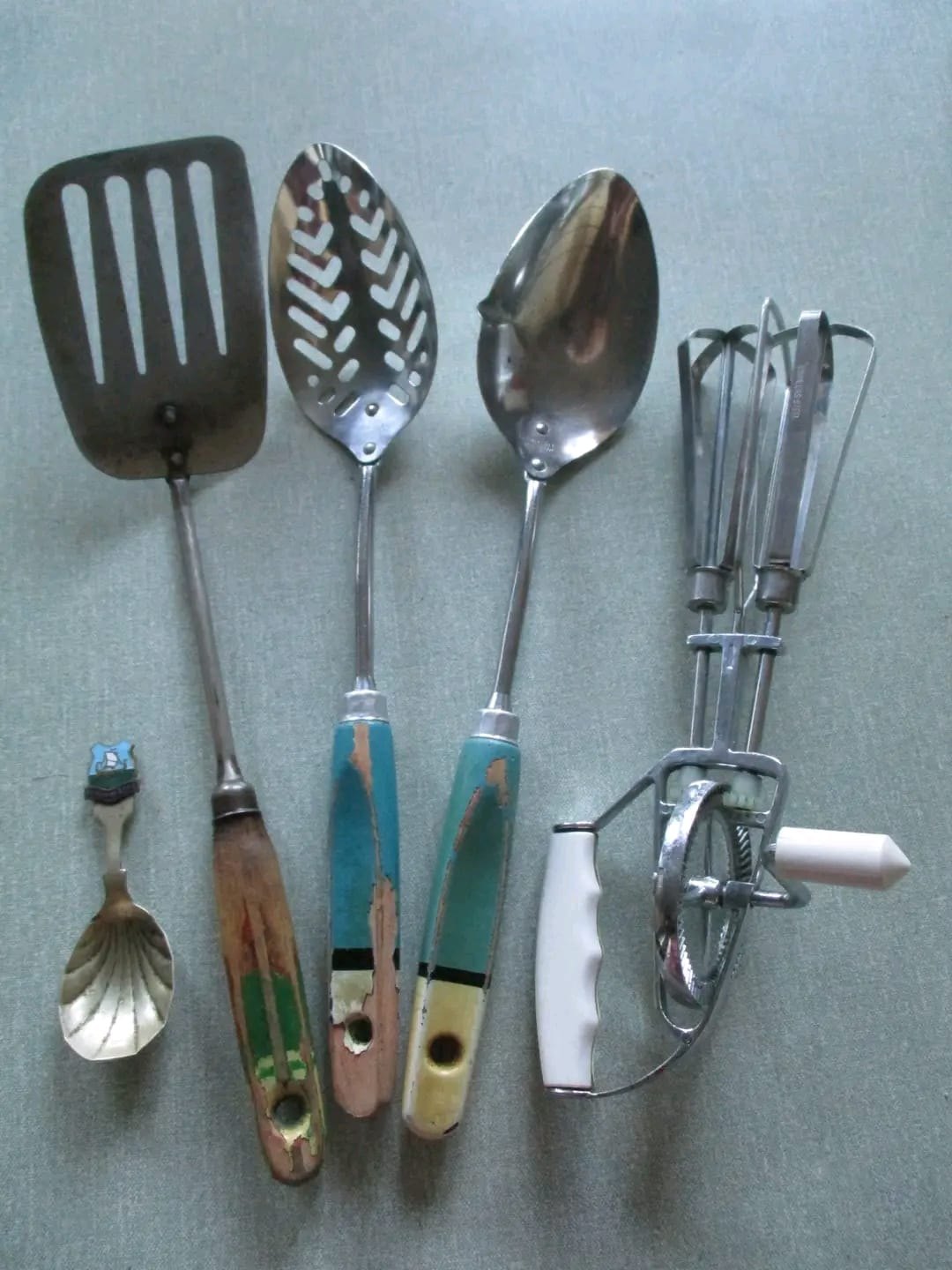 Drewniane uchwyty: Uchwyty tych przyborów, prawdopodobnie wykonane z drewna lub staromodnego plastiku, godnie się zestarzały. Zużycie i zniszczenie dodają charakteru, pokazując lata użytkowania i pielęgnacji. Przypominają o kunszcie, jaki w przeszłości wkładano w narzędzia kuchenne.