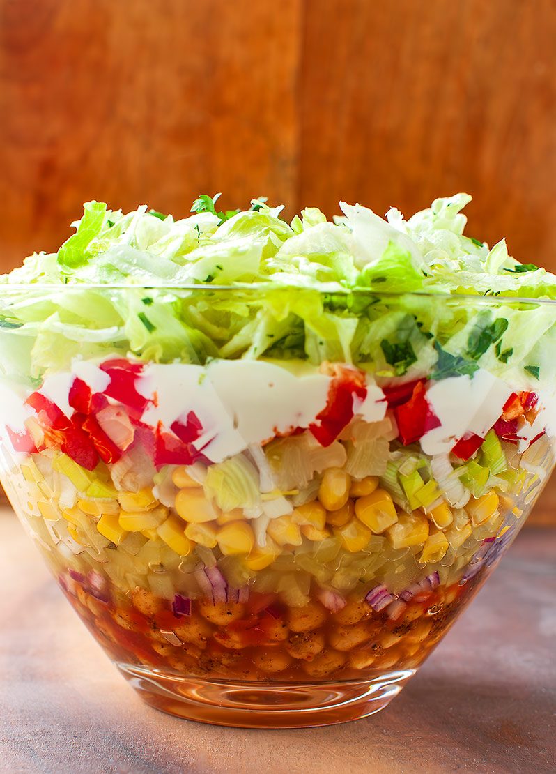 Sałatka Gyros z ciecierzycą – warstwowa sałatka z ciecierzycą podsmażaną w przyprawie gyros, z sałatą lodową, ananasem, kukurydzą, porem, papryką i majonezem. Pyszna sałatka wegetariańska na imprezę!