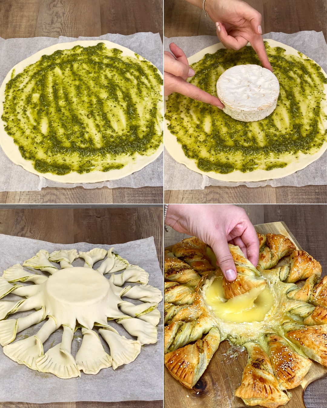 Rozłóż pesto na okrągłym cieście francuskim.