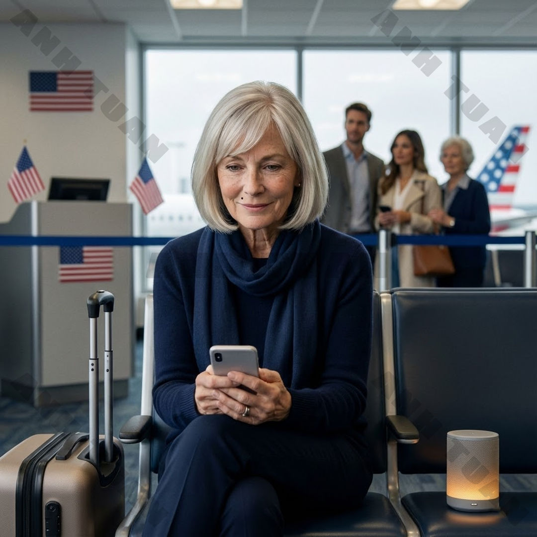 Miała na sobie wygodny strój podróżny: spodnie z gumką w pasie, kwiecistą bluzkę, lekki kardigan, a jej wygląd oscylował gdzieś pomiędzy ekscytacją a lekkim dyskomfortem. Jej włosy, teraz bardziej siwe niż blond, były spięte w schludny kok. Na walizce widniała metka z Maui.