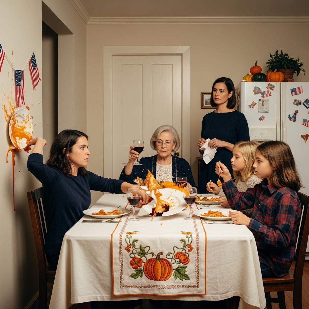 Święto Dziękczynienia w naszej rodzinie zawsze zaczyna się tak samo: za dużo hałasu, za dużo rąk mieszających poczucie winy i sos. Telewizor grzmi mecz piłki nożnej albo parady, dzieci krzyczą, a dorośli udają, że tak właśnie wygląda bycie razem.