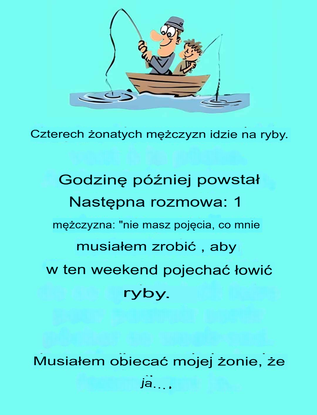 „Nie wyobrażasz sobie, co musiałem obiecać! Moja żona kazała mi przysiąc, że w przyszły weekend pomaluję cały dom. Każda obsada linii kosztuje mnie puszkę farby!”