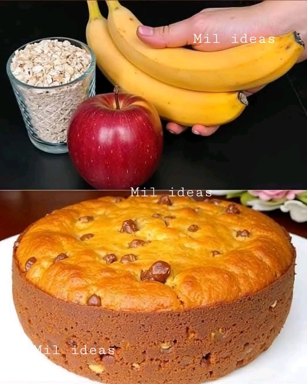 BIZCOCHO DO SALA Z AVENA Składniki: 2 dojrzałe banany 1 jabłko (najlepiej czerwone, słodkie) 1 płatków owsianych 2 jajka 1 łyżeczka proszku do pieczenia 1/2 ciasta cynamonu w proszku (12/12 ml) surowe warzywa lub napój 1 dodatek miodu lub słodzika do smaku (opcjonalnie) 1 garść orzechów lub rodzynek (o) przygotowania: