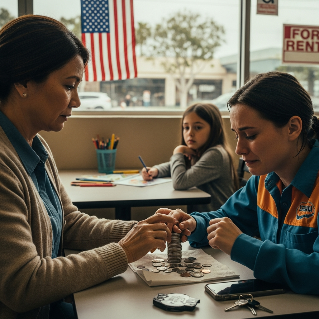 Moja córka, która kiedyś nosiła dopasowane uniformy ze szpitalnego butiku i jeździła nowym Highlanderem, którego pomogłem jej kupić zaledwie dwa lata temu, siedziała teraz sama w brzęczeniu świetlówek, licząc monety, żeby kupić małą kawę.
