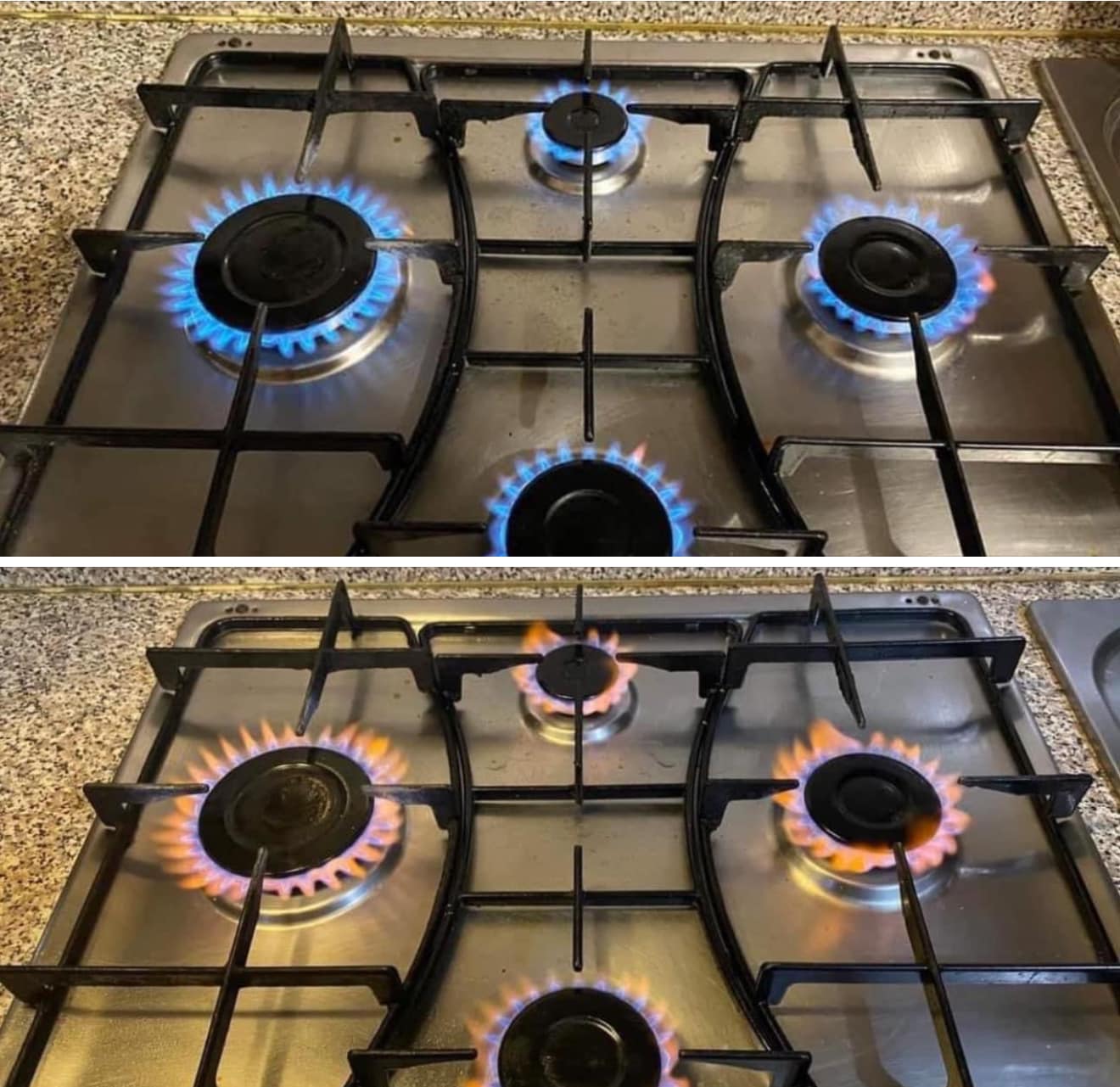 Czerwony płomień – Rzadko spotykany, ale związany z poważnymi problemami technicznymi, takimi jak zanieczyszczenie dysz gazowych.